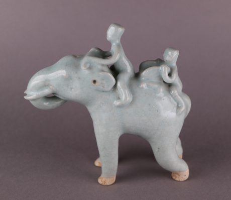 象に、象使いと思われる二人の人物が乗る青磁の造形品である。これより小さな類型品を見ているが、この作品は大型といってよい。