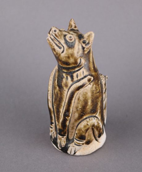 犬形の器体に彫を施し褐釉を施し焼成した大型の肖形である。