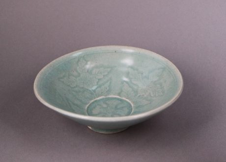 出土した多くのスコータイ作品の中で法螺貝文の中鉢のものは殆どなく、実見したのは他に1点で、この深めで端反りの鉢は希少といってよい。