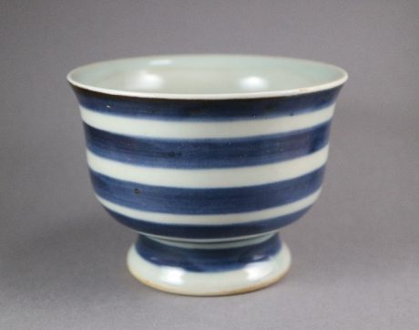 口辺も高台も撥形に開き、太い筋の文様を施した典型的な古染付茶碗である。