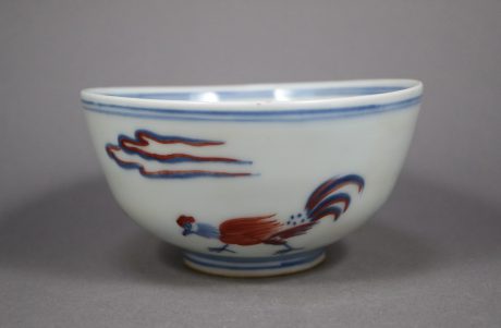 染付の発色も透明感があり、釉薬も均一で、焼成後に赤絵で鶏や花、雲を描いている。