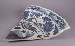 中国元代に景徳鎮窯で焼造された青花大皿の陶片。