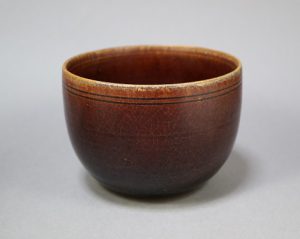 わずかな削り出しの高台を持つ筒形の碗で、黒褐釉が均一に品良くかかる。