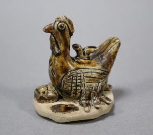 ヒナを周りに9匹、背中に1匹載せ、前に卵を見せた鶏の親で、こちらを見ているような表情にも見え、小品ながら母鳥の凛とした姿が微笑ましい。