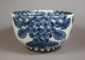 古染付の典型的な文様として名高い葡萄文の鉢である。この文様を模した碗や鉢は人気があり、相当数作られてきたが、出土したものは絵のタッチ、呉須の色、文様ダミのグラデーションなど、模したものは到底及ばないオリジナル性がある。