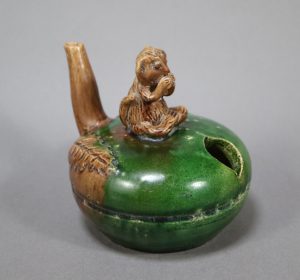 中国では古来、桃は不老不死の霊果といわれ、それを題材としたもので、猿が霊桃を食べる仕草がユニークである。桃の枝部分を注ぎ口とした意匠も斬新である。