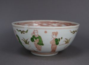 薄作りで緊張感の漂う美しい形の碗は、明代成化期の景徳鎮作品と思われ豆彩と類型のものと考えられる。釉薬は均一で、焼成後に赤と緑で楽人であろうか人物や黄色を交えた瓔珞文を描いている。絵付けの技術は高度で品良く、景徳鎮磁器のひとつの到達点が見て取れる作品である。