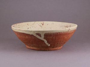 鉄分の多い粗い胎土に灰釉を用いたモン陶器の平碗である。