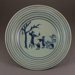 一回り小さな同図の皿もある。胎土、釉薬、作りから天啓年代景徳鎮民窯の作品と考えられる