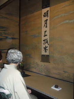 「住之江の間」の床の間廻りは狩野山楽筆の障壁画、脇床の地袋戸に螺鈿が施されているなど見所が多い。(写真 先年のお茶会風景 トップP写真・臨春閣外観)