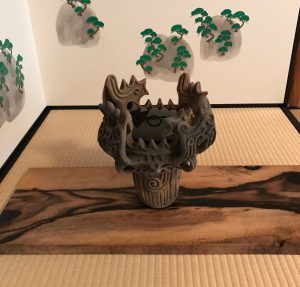 その折の茶事で使用した水指は縄文中期の火焔土器です。これは新潟県の信濃川流域の十日町付近馬高遺跡出土で、紀元前3000年、約5000年前のもので、共に新潟県繋がりでした。これに中子を仕組み、水指に仕立てたものです。