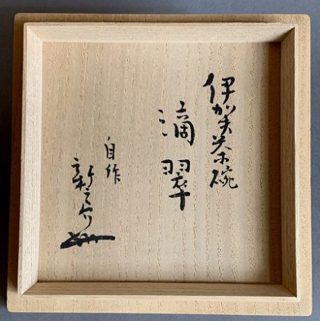 窯から出てきた時、茶碗の見込み底に溜まったビードロは美しく、まるで滴たる翠でした。即座に、当時ご厚誼頂いていた岐阜瑞龍寺僧堂の清田保南老師の軒号「滴翆軒」を想起し、銘としました。