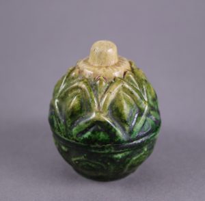 最初は形物の交趾香合「蕗薹(ふきのとう)」。同時期に緑のやきもの(白釉緑彩陶)の壺を入手しました。これが縁の始まりでした。