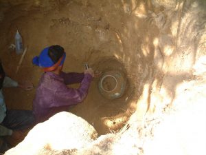 発掘している穴は6ヶ所あり8人が掘っていた。他の数ヶ所はすでに埋め戻され以前から掘られていたことが分かる。緑釉の壺が出た場所は2人が入っていた。穴の深さ約2.5M、直径2Mほどである。