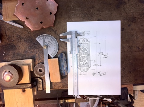 (写真 中 太田のデザインした図により製作にかかる森本錺金物製作所の作業場風景)