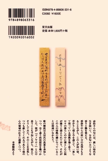 私は戸惑いながら解説の重大さに気付かされはしたが、彼の添えてくれた文が心地よく、歌題を伏せたことで秘かに笑える有難さも味合わせてもらった。また俳句と和歌が句歌集として出版されるのは稀で、この種の私本的解説も類例が少ないと聞き及んだが、乙な内容のものになったのではないかと思う。今はそのまま何もかも委ねたことを嬉しく思っている。心より厚くお礼申し上げたい。(後略)