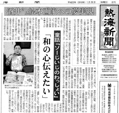 新之介文庫長の佐々木です。 絵本「ソーじいじのわっしょい」の絵を描かれた 酒井理恵子さんが新聞の一面に掲載されました。 皆さんが理恵子さんの才能に注目しているようです。 記事は絵本画家の詳細を伝えています。 一か月前、新宿「紀伊国屋の原画展」の成功が思い出されます。 これからの活躍が楽しみです。 新之介さんの喜んでいる顔が目に浮かびます。 皆さん、お読み頂き理恵子さんにご感想をお寄せください。