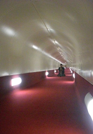 (写真 水晶殿から伊豆大島を観るKNOBさん 水晶殿アプローチの不思議なズイドウの中での奉納演奏)