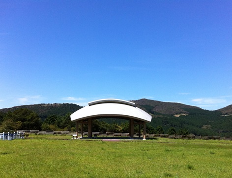 写真 天城の森「お野立ち所」全国植樹祭、育樹祭メインステージ(掘立式の木の建築です。設計:太田新之介)