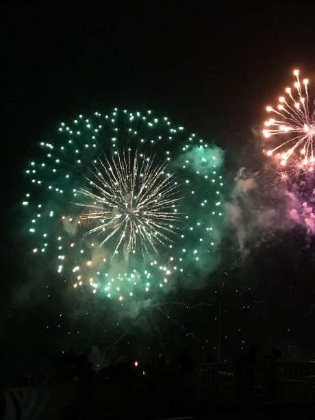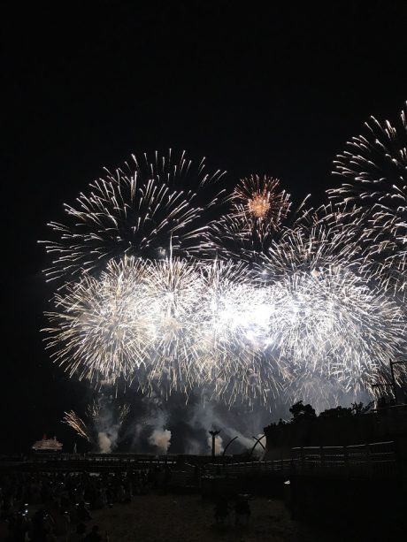 砂浜の階段で見上げた花火の色は多様で、前にもましてグラデーションがかかり神秘的でした。さすが日本の花火は世界一。