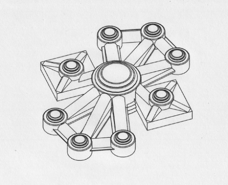 中央ドームは直径70メートルの空間に2基のロケットと組立て中の人口衛星を配備し展示のみならず、ロケットの製作過程を見ることができる。最上階は中央管理室とSCJ本社。階下は眺望レストランと大浴場を設ける。