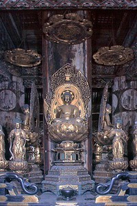 東寺の開山である空海は、釈迦の墓である5重の塔の初層に壮麗な装飾を施し、その須弥壇(しゅみだん)上に阿閦如来(あしゅくにょらい)、宝生如来(ほうしょう)、阿弥陀如来(あみだ)、不空成就如来(ふくうじょうじゅ)の金剛界四仏と八大菩薩を配しています。