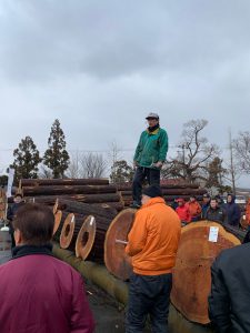 百人ほどが見守る中、二十社以上での競りは進み、そして予定した大径杉へ。私は競りを依頼した競り子の左後ろに立ち、見守りました。その時、得も言われぬ高揚感に見舞われ、静かな興奮の中にいました。冷たい空気も気にならない感覚でした。