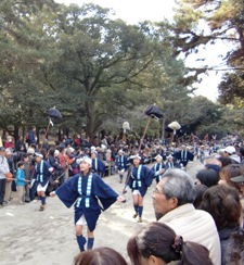 私が最も興味を惹かれ、その日寒空に立っていたのは、大社の若宮が仮宮に移られる仮設社の造りに興味があったことと、その小さな社(やしろ)の前に造られていた「芝貼りの舞台」を見たかったからでした。そして、その芝の舞台で繰り広げられる数々の舞楽で、わけても能楽の元になっている猿楽がどのように演じられていたのかを、この目で確かめることでした。