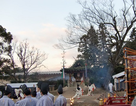 それに続き、社伝神楽、東遊、田楽、細男、猿楽、和舞、そして11曲の舞楽が夜11時頃まで続きます。参道では競馬、流鏑馬も行われます。