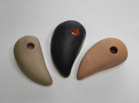 (写真 夢のなかでできた土笛 左から生作り、漆金箔仕上げ、素焼き 2013.6月作 丹波お砂焼 L:75㎜ほど)